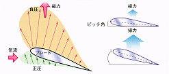 この揚力は,ブレードが空気に当たる角度(ピッチ角)が,一定のところまでは大きくなるほど増大し,小さくなるほど減少します。そのためブレードはピッチ角を任意に変えられる構造になっていて,上昇する際にはすべてのブレードのピッチ角を大きくします。