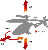 上昇・下降・左右旋回/前進・後進の自在な飛行が可能。