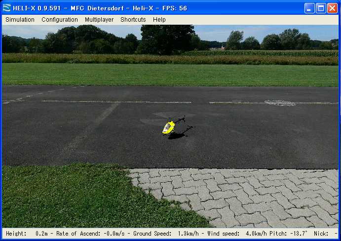 ヘリの挙動はFMSやClearViewよりもリアルな感じがします。またローター音も、ピッチに応じてバフェッティング音がするなどリアルです。それだけに操縦はかなりむずかしいので、Flight modeでエクスポネンシャルを増やし、ピッチカーブをなだらかにするとホバリングしやすくなります。