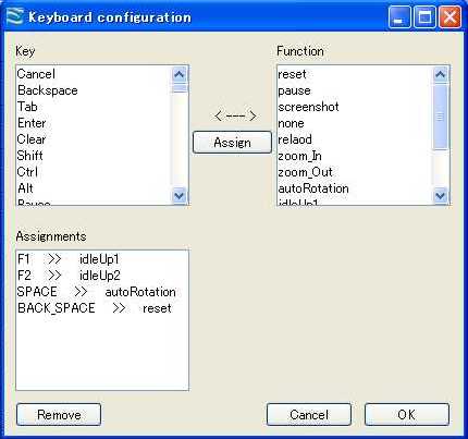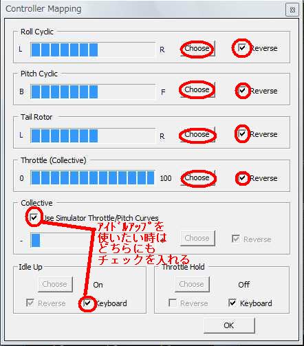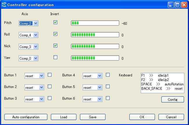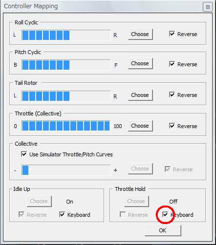 USBジョイスティックあるいはUSBインターフェースケーブルで手持ちの送信機(プロポ)を使用します。送信機の設定(configulation>contorller)でスティックの割り当てを行いますが、このとき適当なスイッチあるいはキーでアイドルアップスイッチの設定をしないとローターが回転しません。