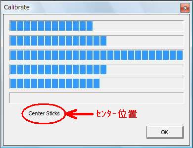 続いてCalbrateを開きます。すると全てセンターにしなさいと言って来るので、トリムも全てセンターにしたら、OKを押します。